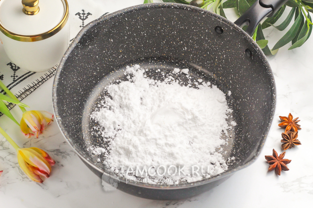 Насыпьте в сковороду с высокими бортиками сахарную пудру или сахарный песок.