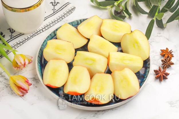 Яблоки промойте в воде, разрежьте на четыре части каждое и вырежьте семенные блоки. Можно нарезать и более мелкими частями, но тогда и время приготовления придется сократить.