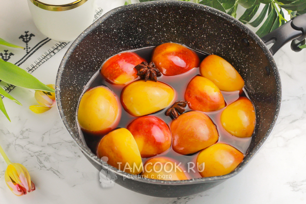 Как только вино закипит, убавьте нагрев до умеренного и выложите в емкость яблоки кожицей вверх, чтобы мякоть оказалась в вине.