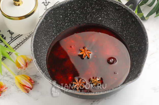 Влейте красное или белое вино и добавьте специи, пряности. Отправьте емкость на плиту, доводя ее содержимое до кипения.