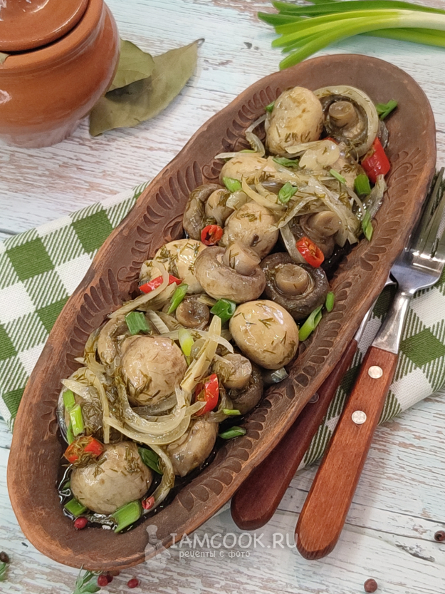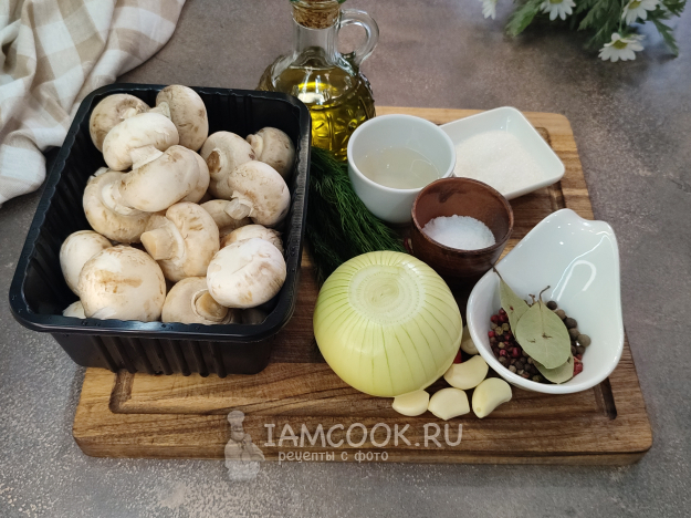 Соберите необходимые ингредиенты для приготовления маринованных шампиньонов с луком. Для бОльшего аромата еще беру немного чеснока и чили, вы берите по вкусу и желанию, конечно). Шампиньоны будут красивее смотреться в блюде, если будут небольшого размера. У меня средние, а крупные можно разрезать на 2-4 части.