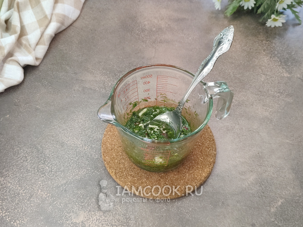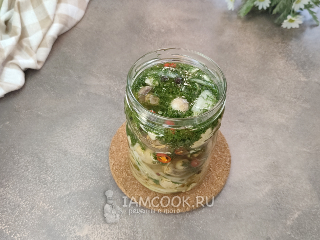 Приготовим ароматную заправку. В миске смешайте уксус, сахар, чеснок, чили, нарезанный мелко укроп, масло. Зачерпните из кастрюли 2-3 половника горячего отвара, в котором варились грибы. Размешайте - нужно, чтобы сахар растворился.