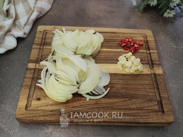 Пока варятся грибы, нарежьте лук соломкой, а чили и чеснок - помельче.