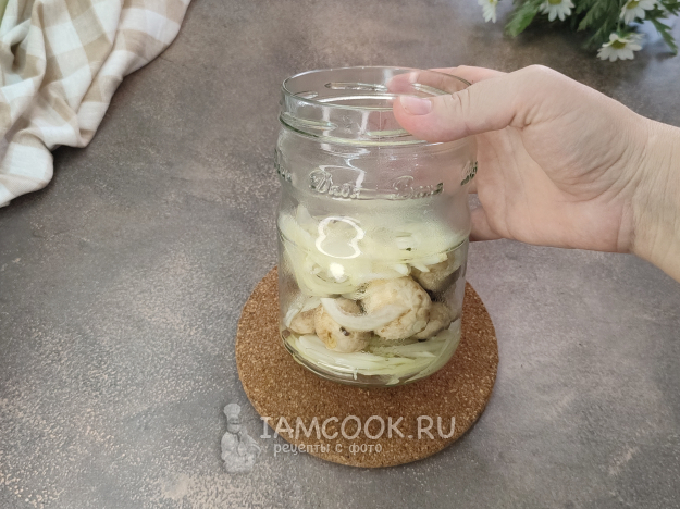 В банку или подходящий контейнер выкладываем слоями лук-грибы-лук-грибы, пока не закончатся грибы). Грибы закладываю в банку ложкой, прямо из кастрюли, если случайно попадаются горошины перца, лаврушка, то это еще даже и лучше)). Заливаем той ароматной заправкой, которую приготовили ранее.