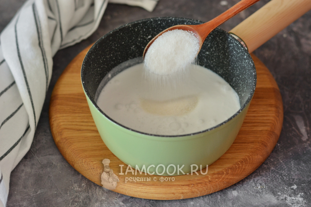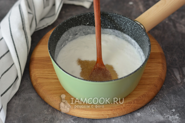 В ковшик влейте кокосовое молоко и добавьте сахар.