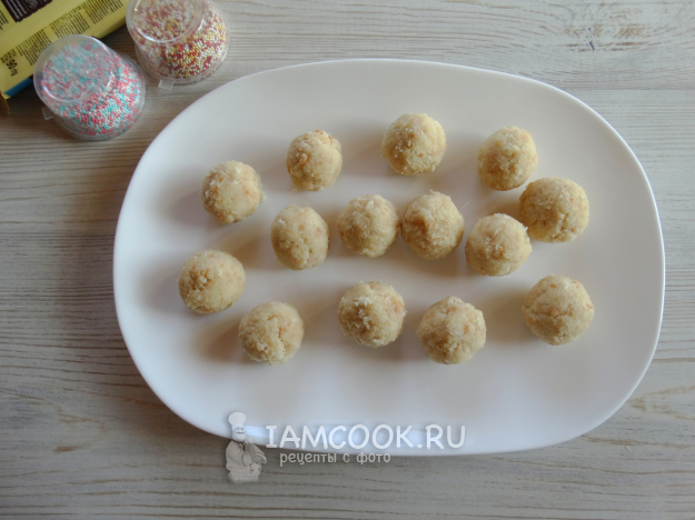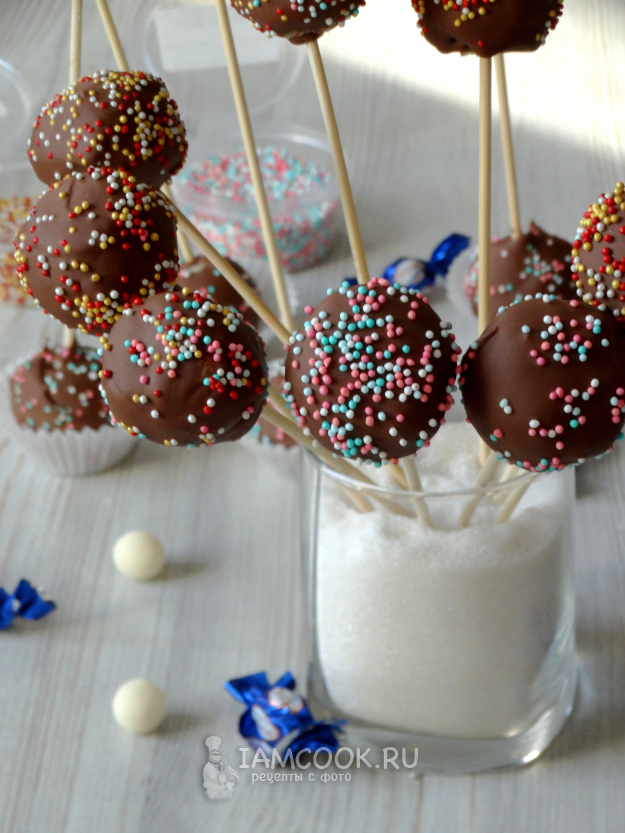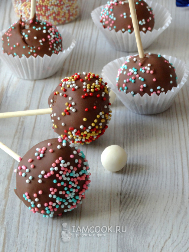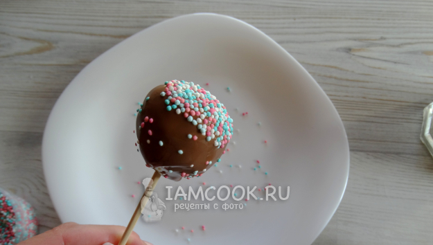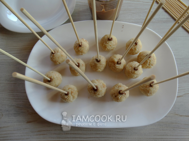 Кончик шпажки (деревянной или пластиковой) окунуть в шоколад, вставить в центр шарика.