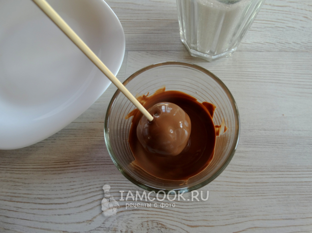 Окунуть шарик в шоколад, немного потрясти, чтобы стёк лишний шоколад.
