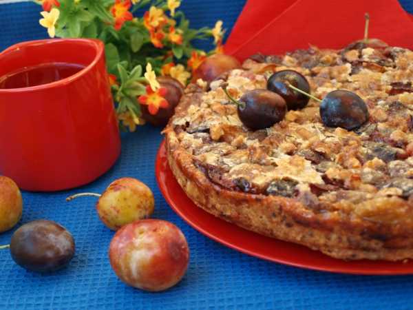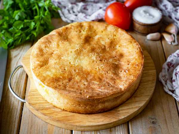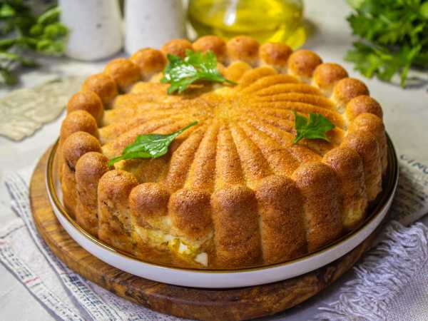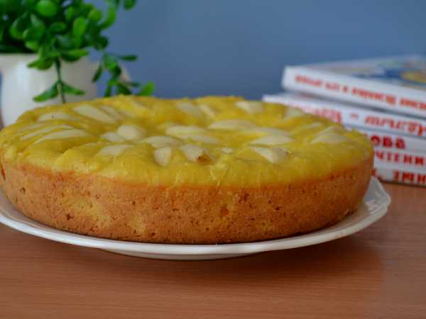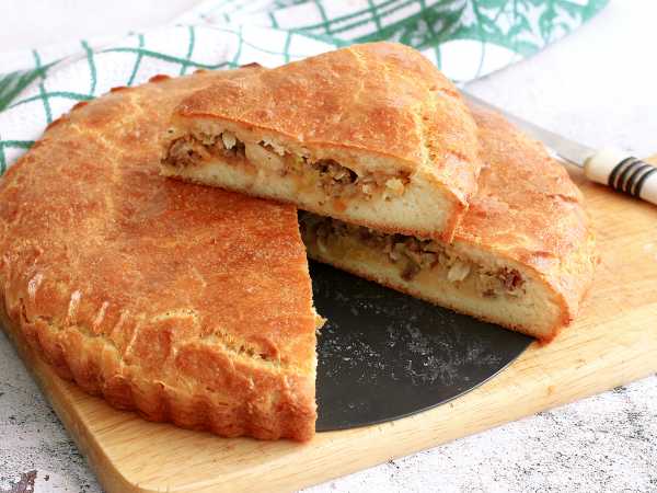 Готовность пирога определите по внешнему виду, и проткнув его середину деревянной шпажкой - она должна выйти из пирога без остатков сырого теста. Достаньте готовый пирог, дайте ему остыть и переложите на блюдо.