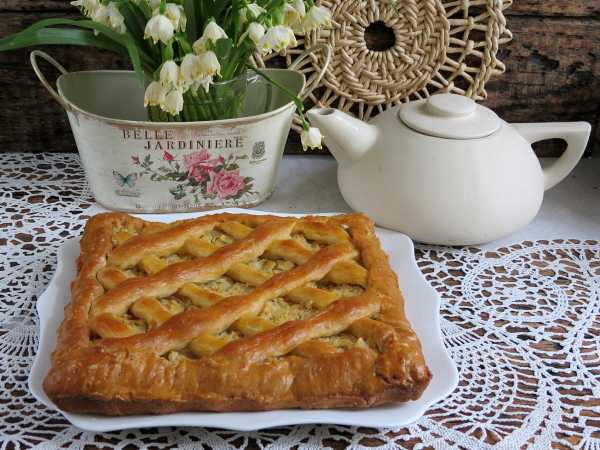 Яично-сырную массу распределите поверх пирога. Поставьте пирог в разогретую до 180 градусов духовку на 40-45 минут.