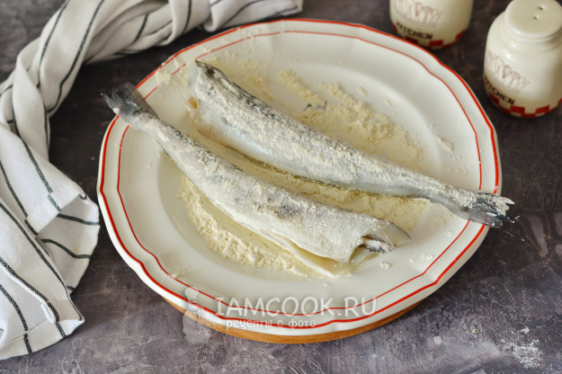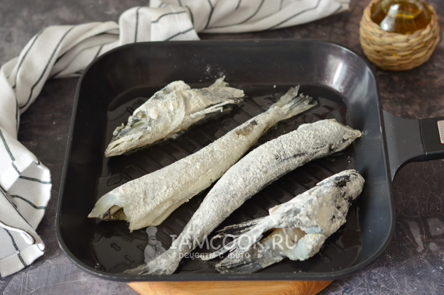 Слегка посолите и поперчите тушки ледяной рыбы и запанируйте их в муке, стряхнув остатки.