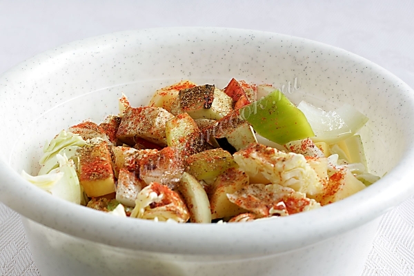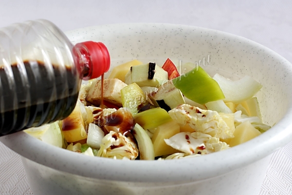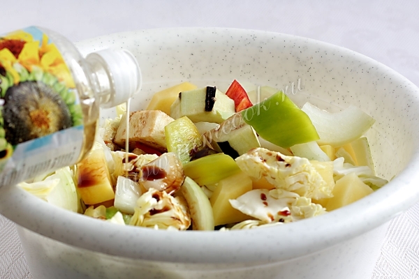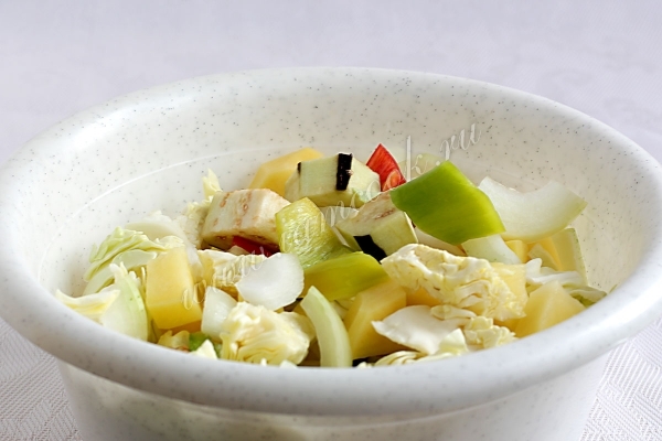 Остальные овощи нарезать крупными кусочками и смешать их в большой, удобной для перемешивания емкости. Нужно учесть, что дольше всего готовится картошка, поэтому и нарезать овощи нужно в соответствии с этим свойством.