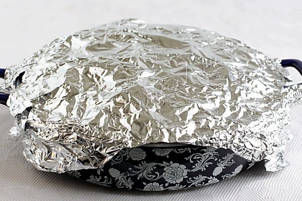Переложить содержимое миски в огнеупорную форму. Если форма железная и тонкая, то следует обложить ее со всех сторон фольгой. Верх формы так же накрыть фольгой. Поставить запекать в горячую духовку. Температура духовки 200 гр. Время запекания зависит от количества овощей и формы их нарезки. У меня стояла 1 час. Пару раз нужно проверять овощи на готовность и перемешивать.