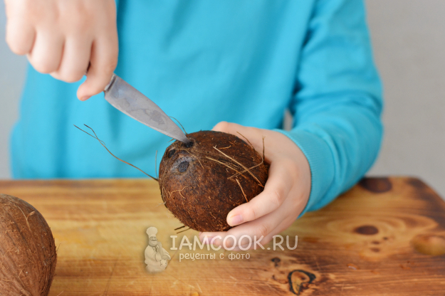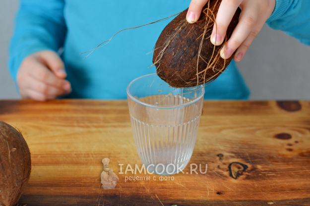 Из кокоса вылейте кокосовую водичку. Она приятная на вкус, её обычно хочется сразу попробовать.