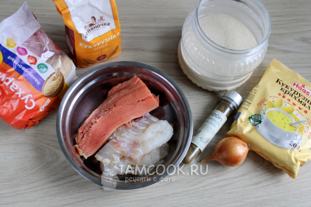 Для котлет из трески и горбуши подготовьте ингредиенты по списку к рецепту. Обычно рыба покупается замороженная, поэтому её нужно заранее разморозить, переложив из морозилки в холодильник. Специи выбирайте на свой вкус или берите готовую смесь. У моей такой состав: кориандр, лук, белый перец, горчичное семя, корка лимона, укроп, петрушка, морковь.