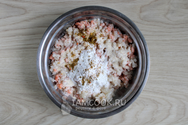 Добавьте манку, крахмал, специи и соль. Перемешайте и оставьте на полчаса, чтобы манка разбухла.