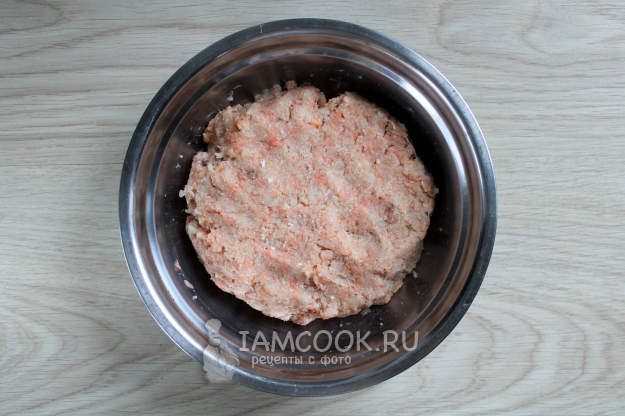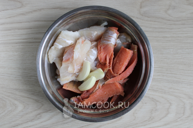 Прокрутите куски трески и куски горбуши вместе с нарезанным луком.