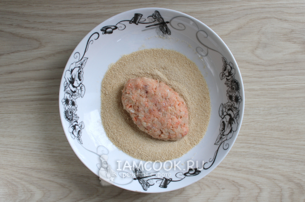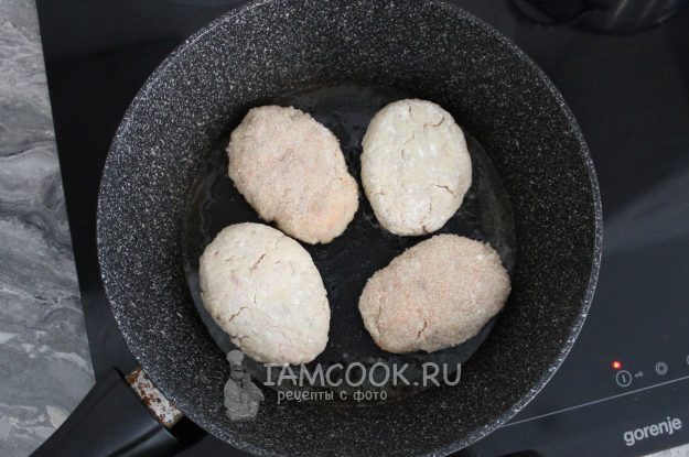 Две котлеты перед жаркой будут обваляны в панировочных сухарях и две - в кукурузной муке. Для жарки берите растительное или топлёное масло.