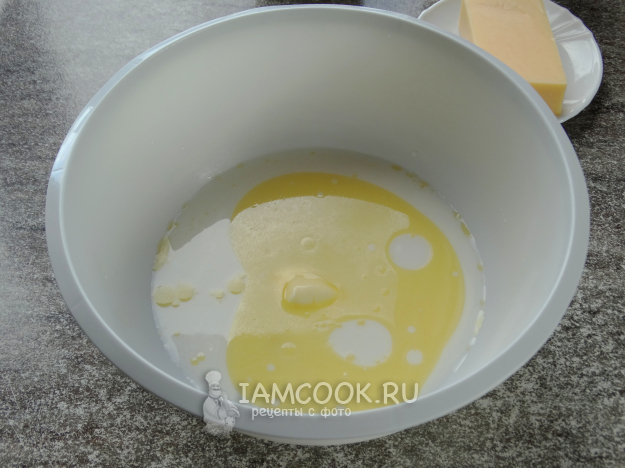 В тёплое молоко добавить соль, сахар, дрожжи и растопленное масло.