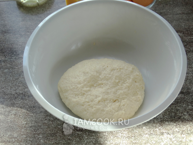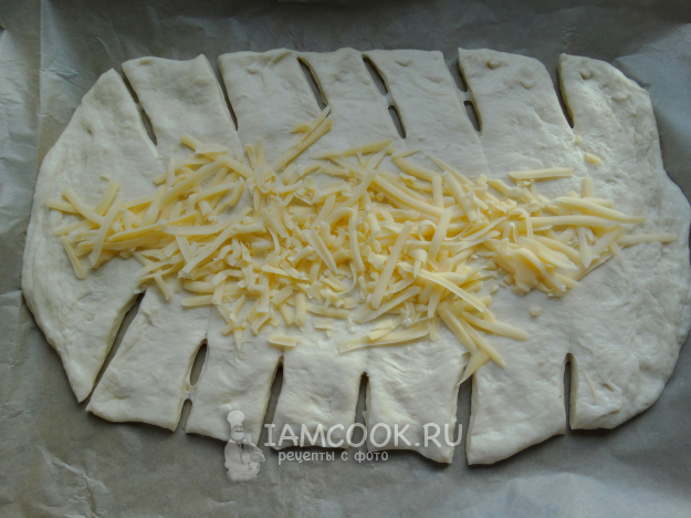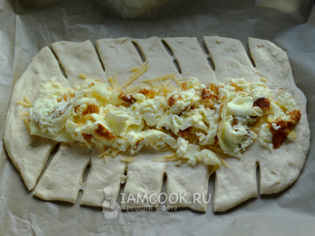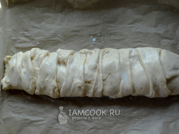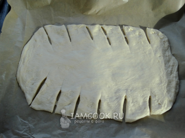 На противне с бумагой для выпечки растянуть тесто в овал.