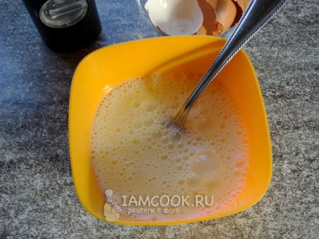 Нагреть сковороду с маслом, вылить яичную смесь, накрыть сковороду крышкой и приготовить омлет на медленном огне.