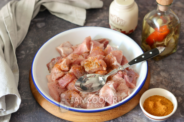 Сложите нарезанную свинину в миску, добавьте по вкусу соль, перец, специи и влейте уксус. Тщательно всё перемешайте, помассируйте мясо и оставьте мариноваться при комнатной температуре на 15 минут. Таким небольшим кусочкам больше и не надо.