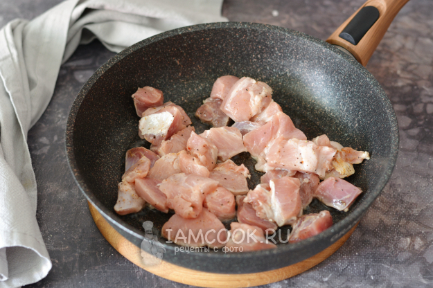 Свинину при необходимости ополосните, обсушите и нарежьте на небольшие кусочки. Для жарки на сковороде оптимально будет нарезать на кусочки по 2-3 сантиметра.
