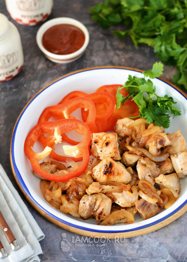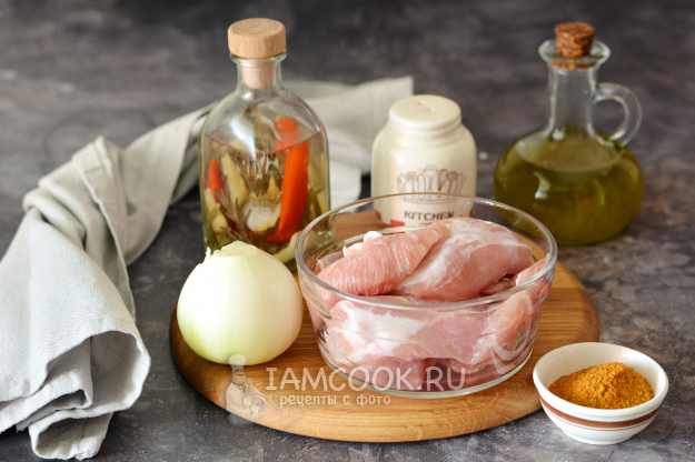 Подготовьте необходимые продукты и будем мечтать о поездке на шашлыки и готовить жареную свинину с уксусом и луком на сковороде.