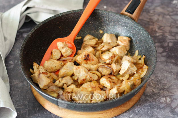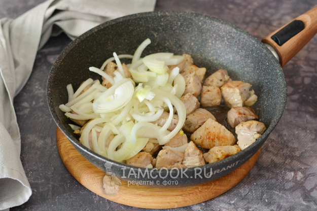 Как только свинина хорошо подрумянилась, бросаем в сковороду лук и продолжаем жарить на раскалённой сковороде, не снижая нагрев.
