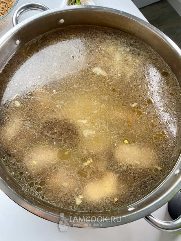 Добавляем воду и на сильном огне доводим до кипения. Убираем пенку.