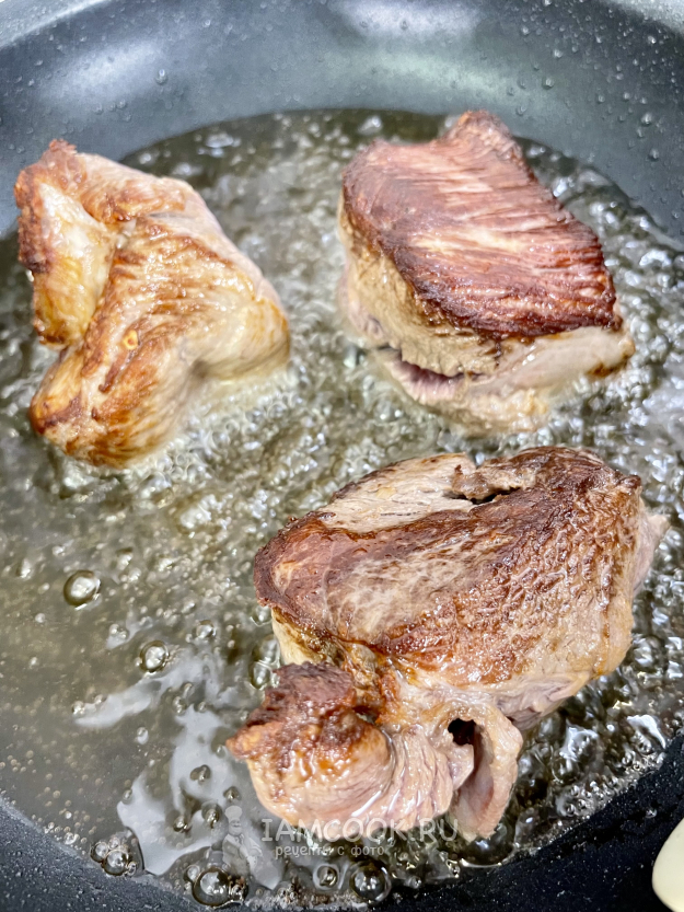 На растительном масле, на сильном огне обжариваем мясо до золотистой корочки.