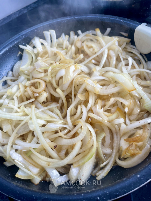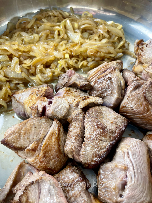 Вынимаем мясо и на этом же масле обжариваем лук до золотистого цвета.