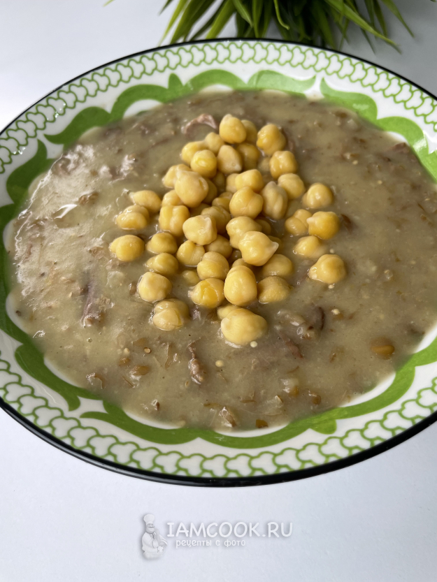 Готовое блюдо наливаем в глубокую тарелку и украшаем отварным нутом.