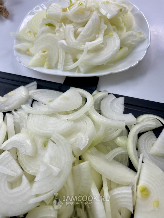 Лук нарезаем полукольцами.