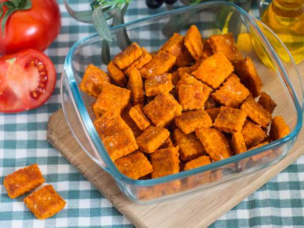 Затем тесто для удобства разделите на две части. Одну часть теста раскатайте скалкой в тонкий пласт на пергаменте для выпекания. Нарежьте тонкий пласт теста ромбами и перенесите пергамент с заготовками крекеров на противень. Каждый ромб-крекер наколите вилкой. Выпекайте крекеры в уже разогретой до 180 градусов духовке в течение 10 минут. Вторым заходом раскатайте вторую часть теста и приготовьте крекеры из оставшегося теста.