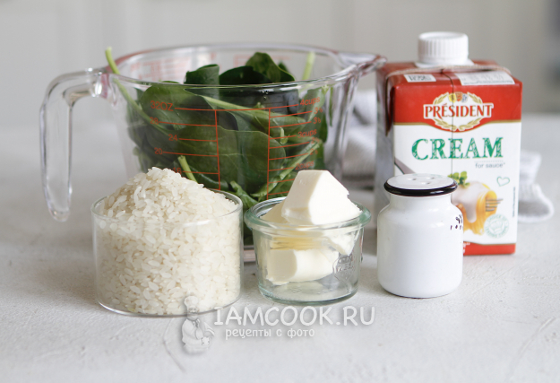 Соберите все необходимые продукты по списку и приступим к приготовлению риса со шпинатом и сливками.