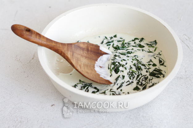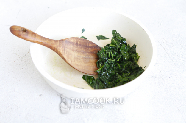 Разогреть сковороду с кусочком сливочного масла и припустить на нем шпинат.