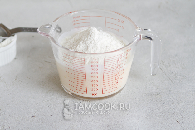 Муку пшеничную просейте через сито, добавьте ее к кефирной смеси и тщательно перемешайте.