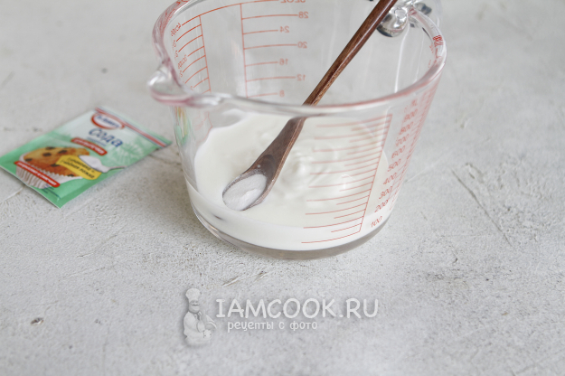 В чашу или кружку для замеса влейте кефир. Добавьте соду, перемешайте ее и оставьте на 2 минуты.