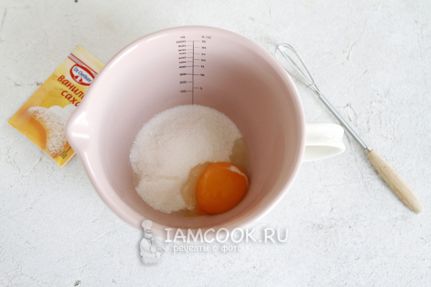 Отмерьте нужное количество сахара, добавьте ванильный сахар. Отделите желток от белка. Белок уберите в холодильник, а желток разотрите с сахаром.