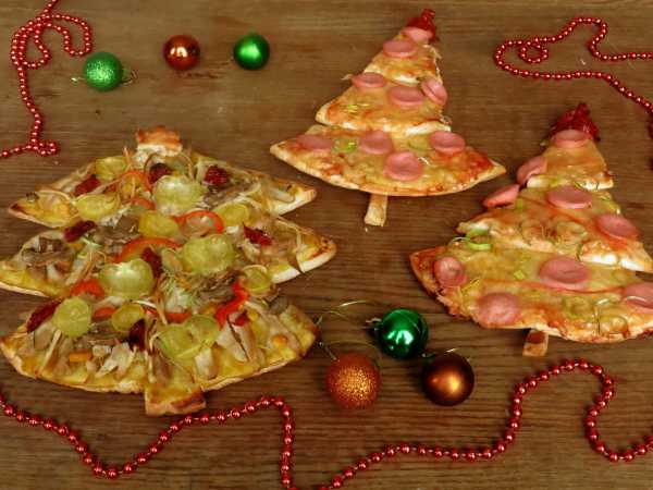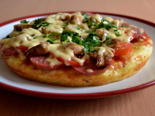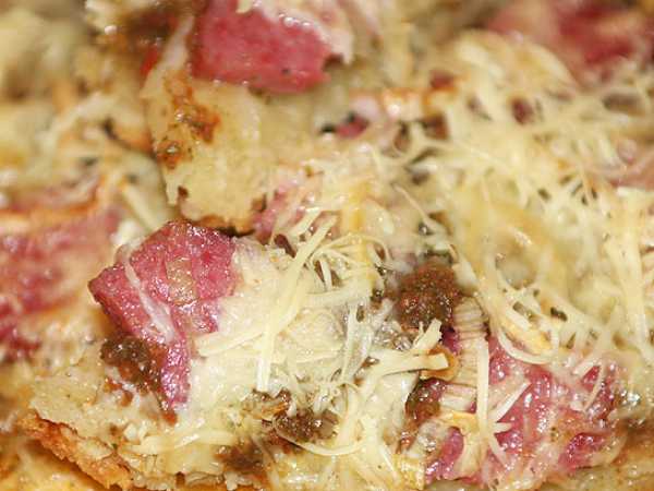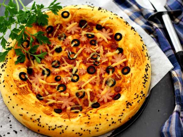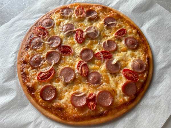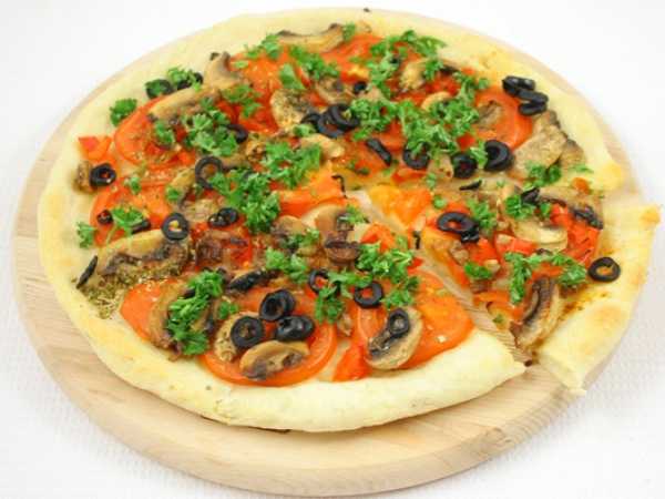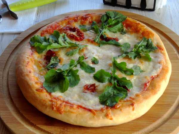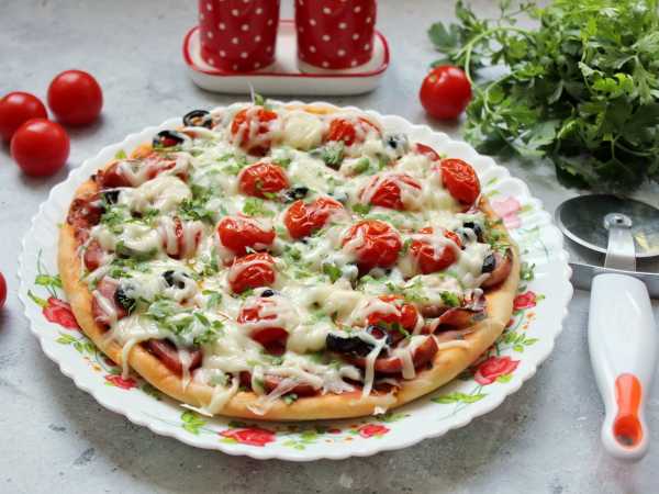Пицца на скорую руку в духовке готова. Украсьте зеленью и подавайте к столу.