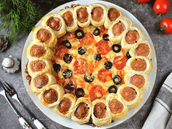 Сосиски покройте тертым сыром. У меня было два вида: обычный полутвердый и моцарелла. Ломтики нарезанного помидора распределите сверху.