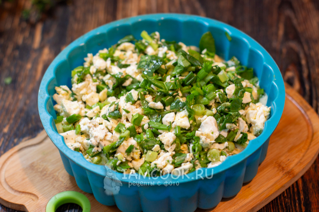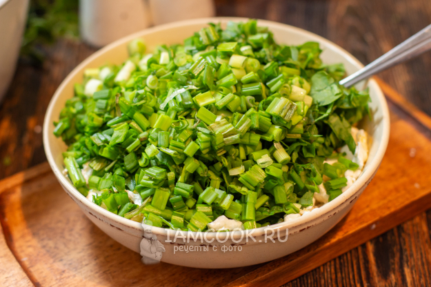 К творогу добавьте нарезанную зелень и перемешайте начинку.