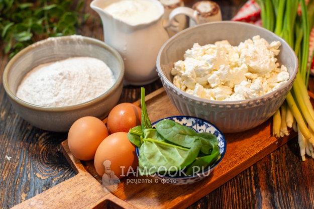 Соберите необходимые продукты для приготовления заливного пирога с творогом и зеленью. Тесто для этого пирога я приготовила на кефире. Начинку приготовила из вкусного домашнего сухого творога со свежим шпинатом и зеленым луком.