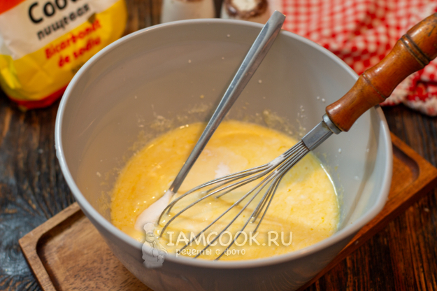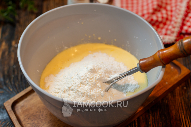 Всыпьте просеянную муку, перемешайте венчиком, чтобы получилось гладкое тесто без комочков по консистенции как на оладьи.