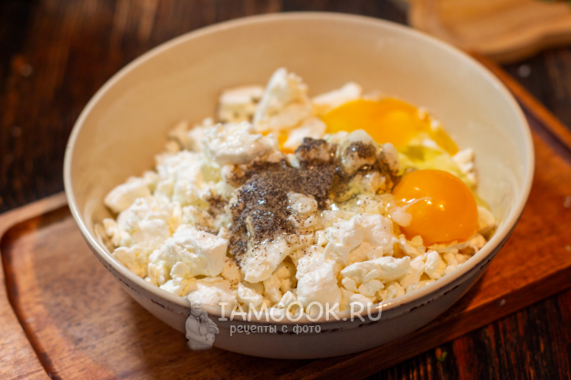 Для начинки возьмите вкусный и качественный творог, добавьте к нему куриные яйца, соль и черный молотый перец. Перемешайте продукты.