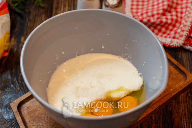 Для теста в подходящую посуду вбейте куриные яйца, влейте кефир и добавьте соль. Перемешайте ингредиенты венчиком.
