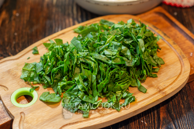 Свежий шпинат промойте и обсушите, нарежьте тонкими полосками. Зеленый лук нарежьте мелко.