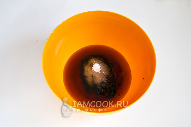 В миску положите варенье, сахар, влейте теплый свежезаваренный черный чай. Перемешайте.