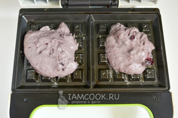 Разогрейте электровафельницу. При необходимости смажьте панели вафельницы растительным маслом и положите по полной столовой ложке теста на одну вафлю.