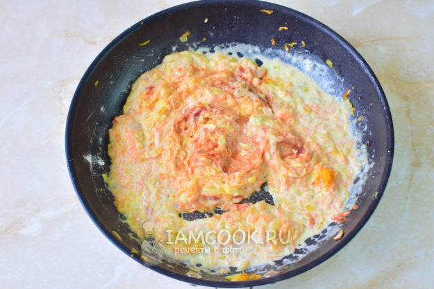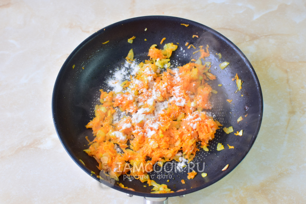 Для подливы обжарьте лук и морковь 2-3 минуты. Немного присыпьте овощи мукой. Смешайте.